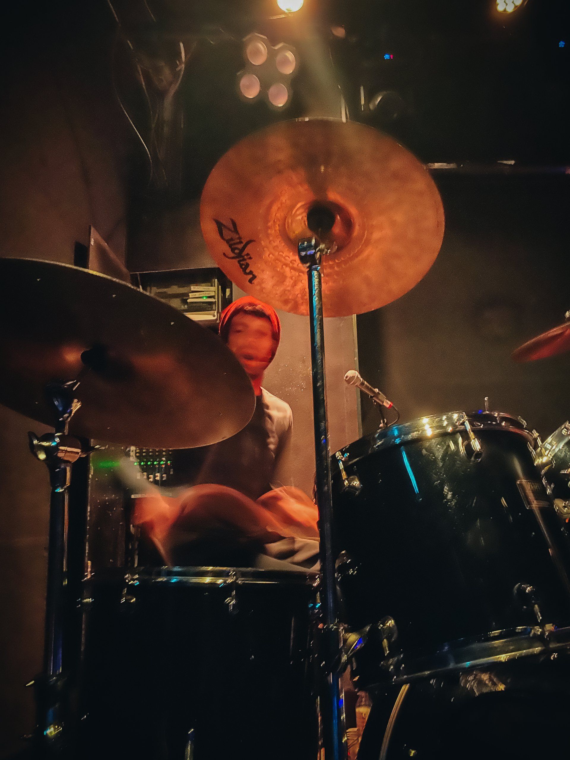 A small CRT TV (the one with a booty, you know?) will probably become Fugitive TV symbol since its appearance on stage in front of Jeroen’s drum kit. Burgundy red hand-written name on its TV static screen should have triggered memories of mindless binge-watching from the olden days: suddenly you are woken up from your living-dead slumber by the noise coming from the lifeless machine that rather looks menacing in a radio silence pitch-black room. Remembering wise words by a prominent media scholar Marshall McLuhan – the medium is the message – the image of an unresponsive electronic appliance that is meant to connect you with the world drowns you under the wave of alienation. The medium of Fugitive TV is just as any other TV: media manipulation and people’s exposure to this kind of input. Already with the opener of their set, Fugitive TV gave a clear position on their stance – they will bring tension and end up with a grand explosion that will grab you by the surprise. It’s almost all about surprises - just like watching a program that you are fully invested in and then interrupted by an ad. Just when you feel like you found the perfect moves to dance to a song they are playing, Jeroen throws the conformist 4/4 rhythm out of the window and instills anarchy with the 13/8 odd beat. There’s a confusion in your face, what looked like sick moves now remind of bodily contortions, and you feel like someone has just pull the rug under your feet while the band on stage is thriving in their instilled confusion.