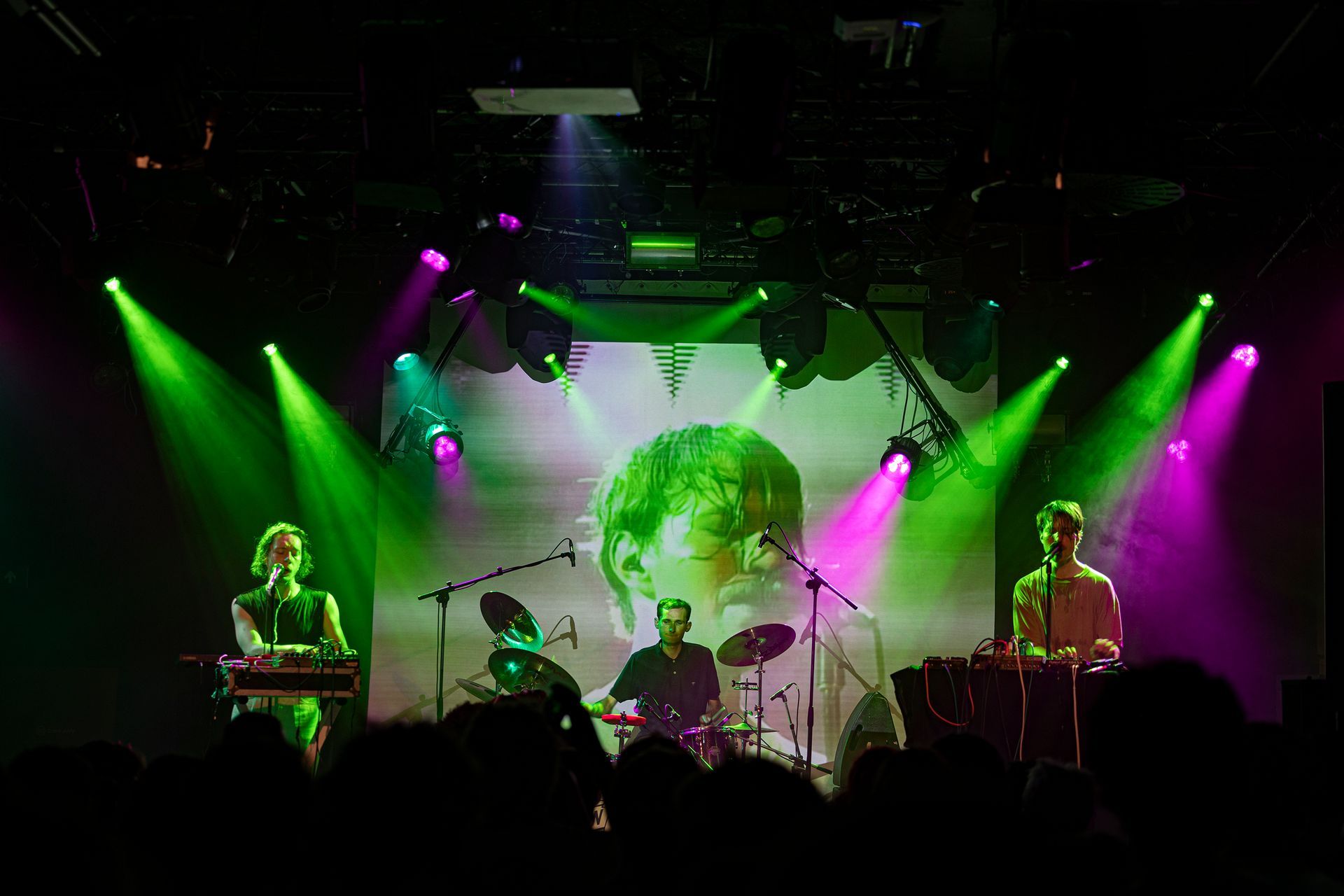 Stipt op tijd begint The Homesick herrie te maken. Met zijn 3en, veel toetsen en knoppen en een drummer komen ze vanavond hun nieuwe self-titled album presenteren.