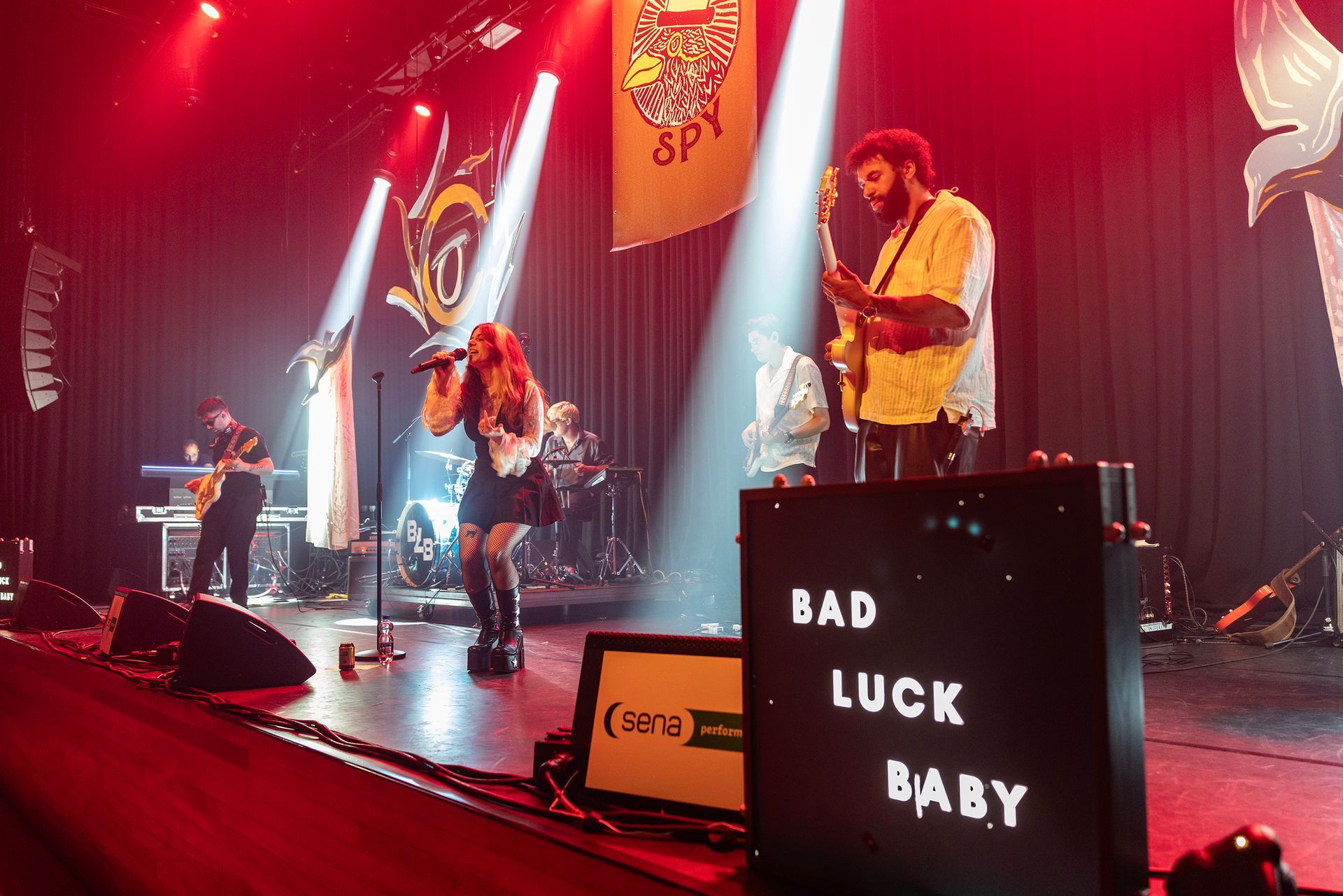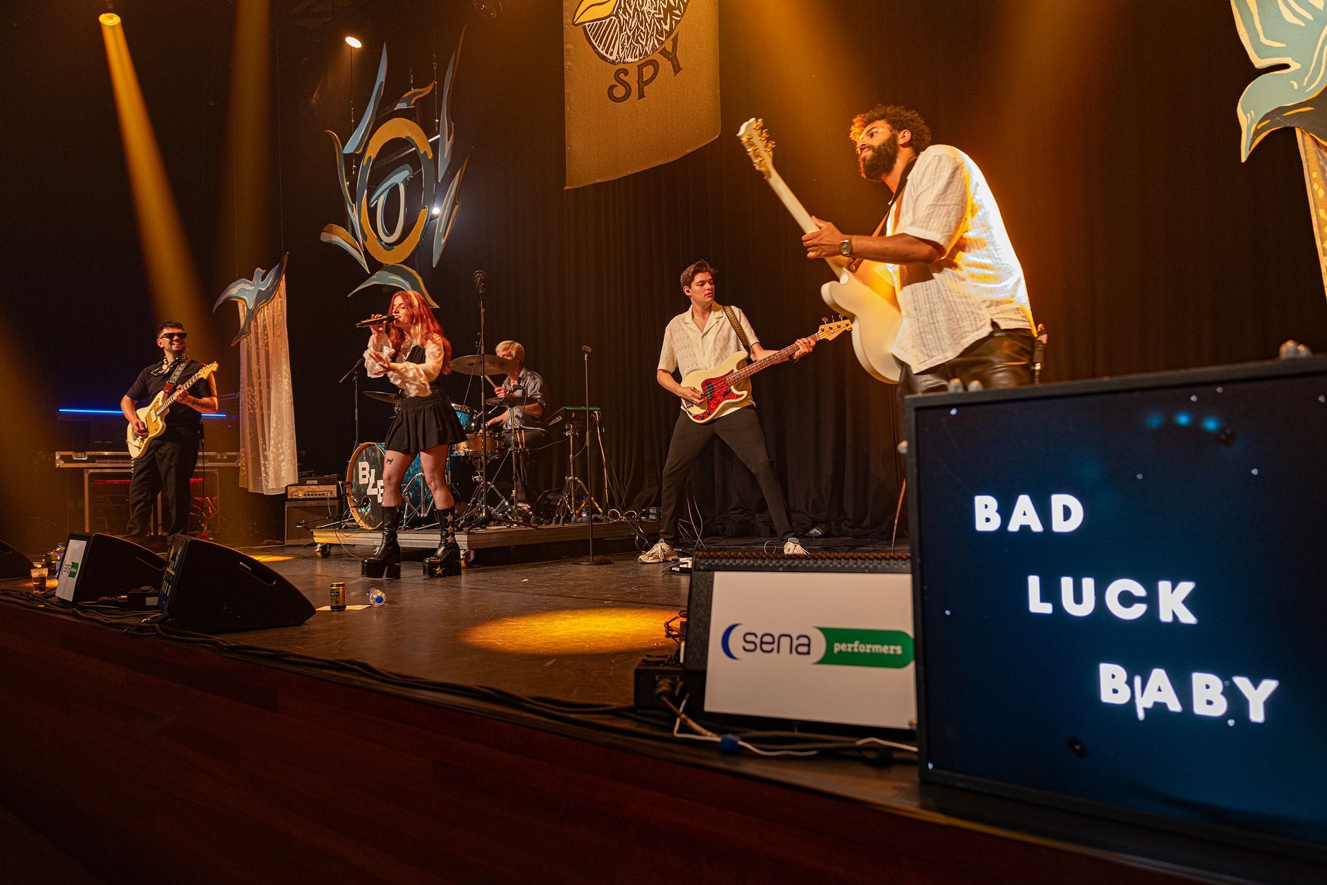 Na een korte welkoms praatje en onder opwellende bas bestijgt Bad Luck Baby het podium van de grote zaal. Met een stevige doorstampende beat gebracht door bas en drum, twee zingende en schreurende gitaren en een krachtige zangeres brengt de band garage rock met een zeer zomerse tint en de nodige theatrale flair.