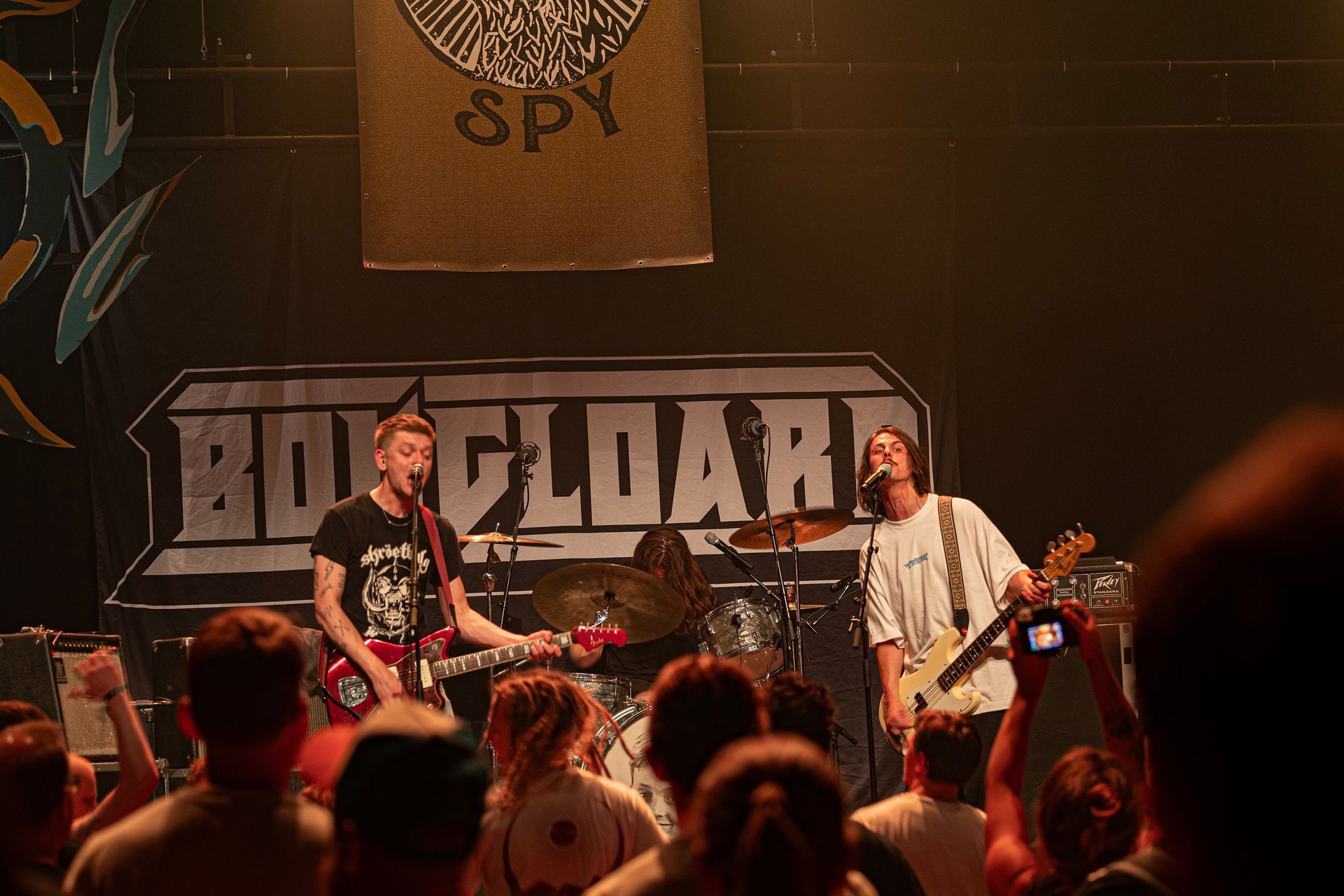 Terug naar de grote zaal voor Bongloard. Die hun Duitse opkomst muziek breken met gitaar gescheur en vervolgens onder sneller dan snelle drummaten doorknallen in hun eerste nummer. De band weet hoe ze de aandacht kunnen krijgen. En als ze die aandacht hebben maken ze ook nog de nodige grappen tussen de nummers door. De band weet hoe ze het podium moeten beheersen.