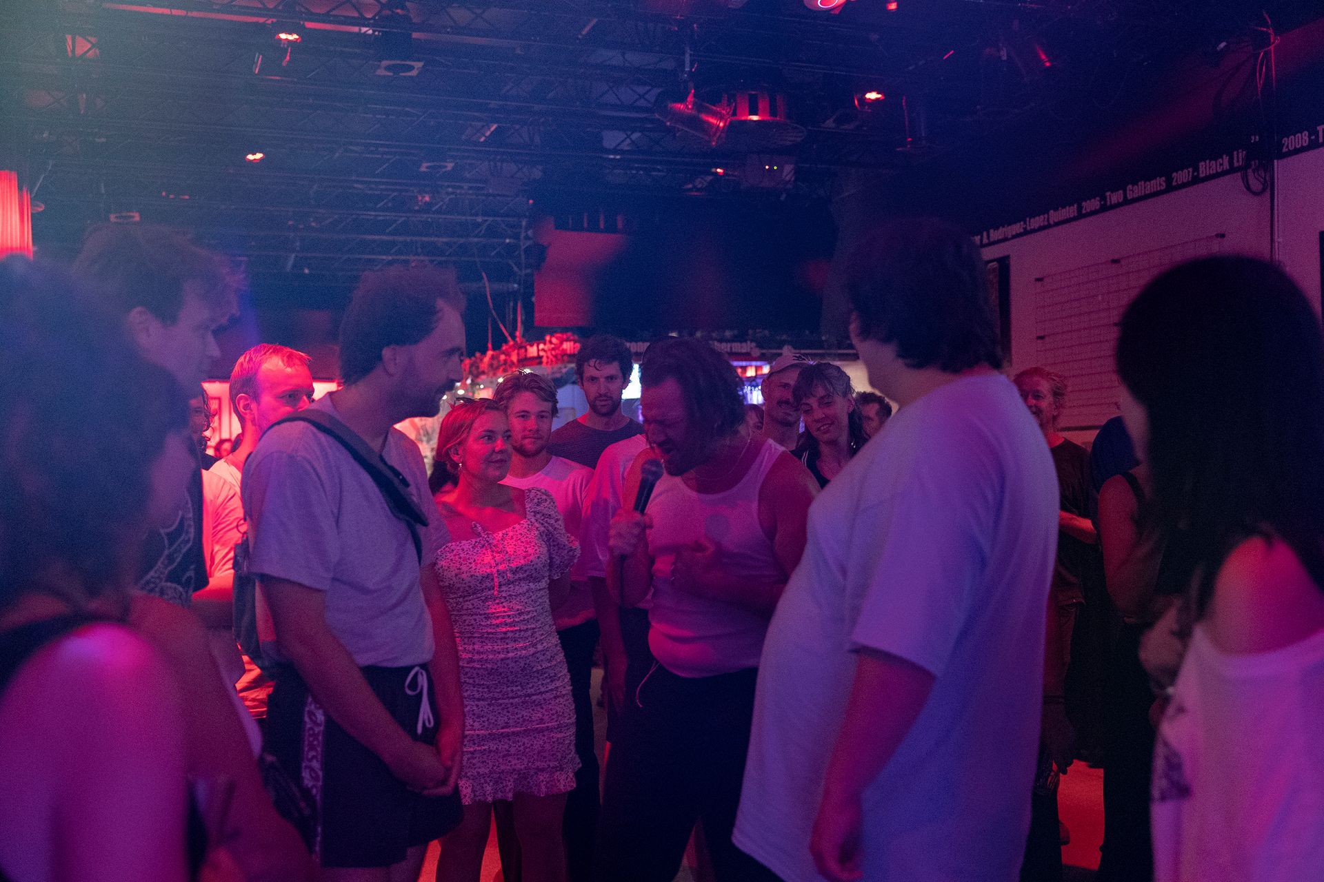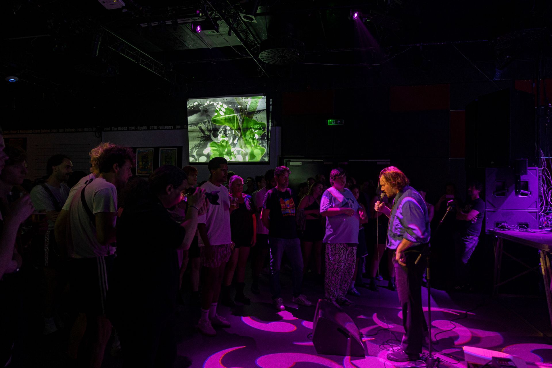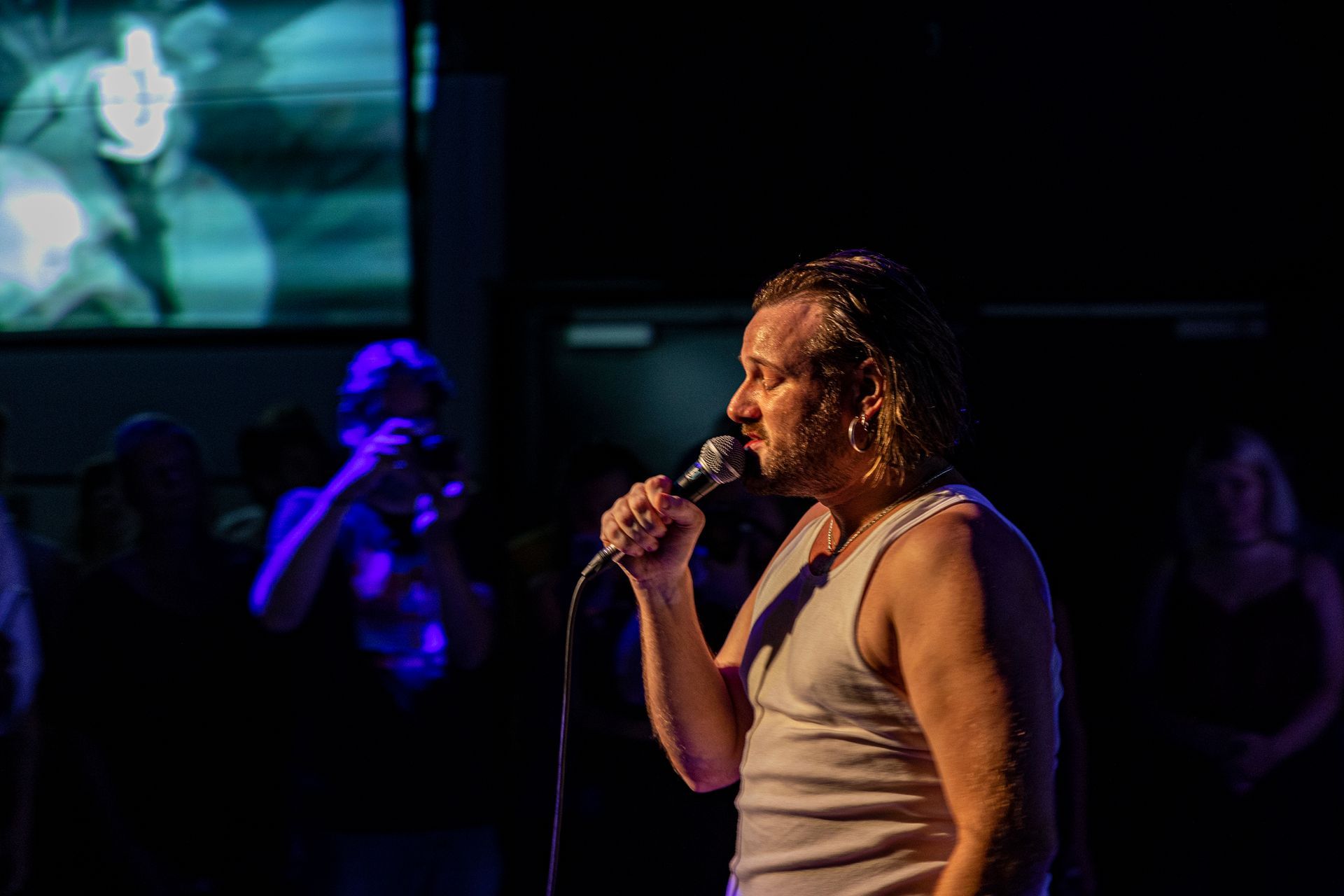 En het gezang van Roy Veenstra (Idiott Smith) is dan ook het hoofdprogramma van de act. De unieke diepe stem weet bijna moeiteloos gevoelens van melancholie en gemis op te roepen. De muzikale tracks samen met de baritone zang maken zelfs mensen die er destijds niet waren nostalgisch naar de jaren 80. Dat de jaren 80 worden opgeroepen is ook duidelijk met de beamers op de muren vol gedateerde effecten die zo populair zijn in de huidige vaporwave trend. Vaporwave is dan ook wel een genre waar Idiott Smith mee flirt. Maar niet precies in valt. Vaporwave, synthpop, dreamwave zijn allemaal op elkaar lijkende stijlen waarvan kenmerken bij Idiott Smith samenkomen tot een intiem eigen geluid. Een eigen geluid dat langzaam mee doet wiegen op de golven van de wave.
